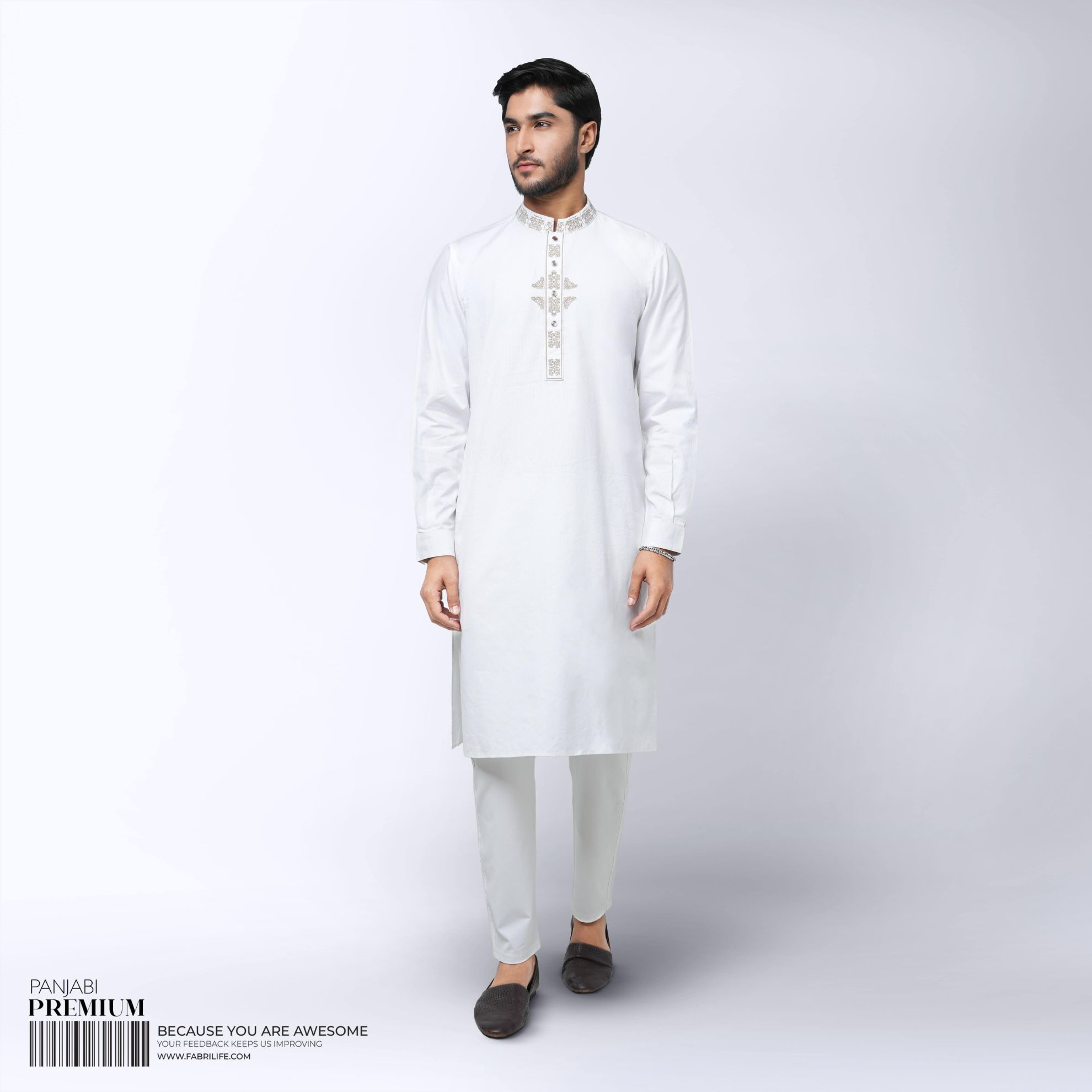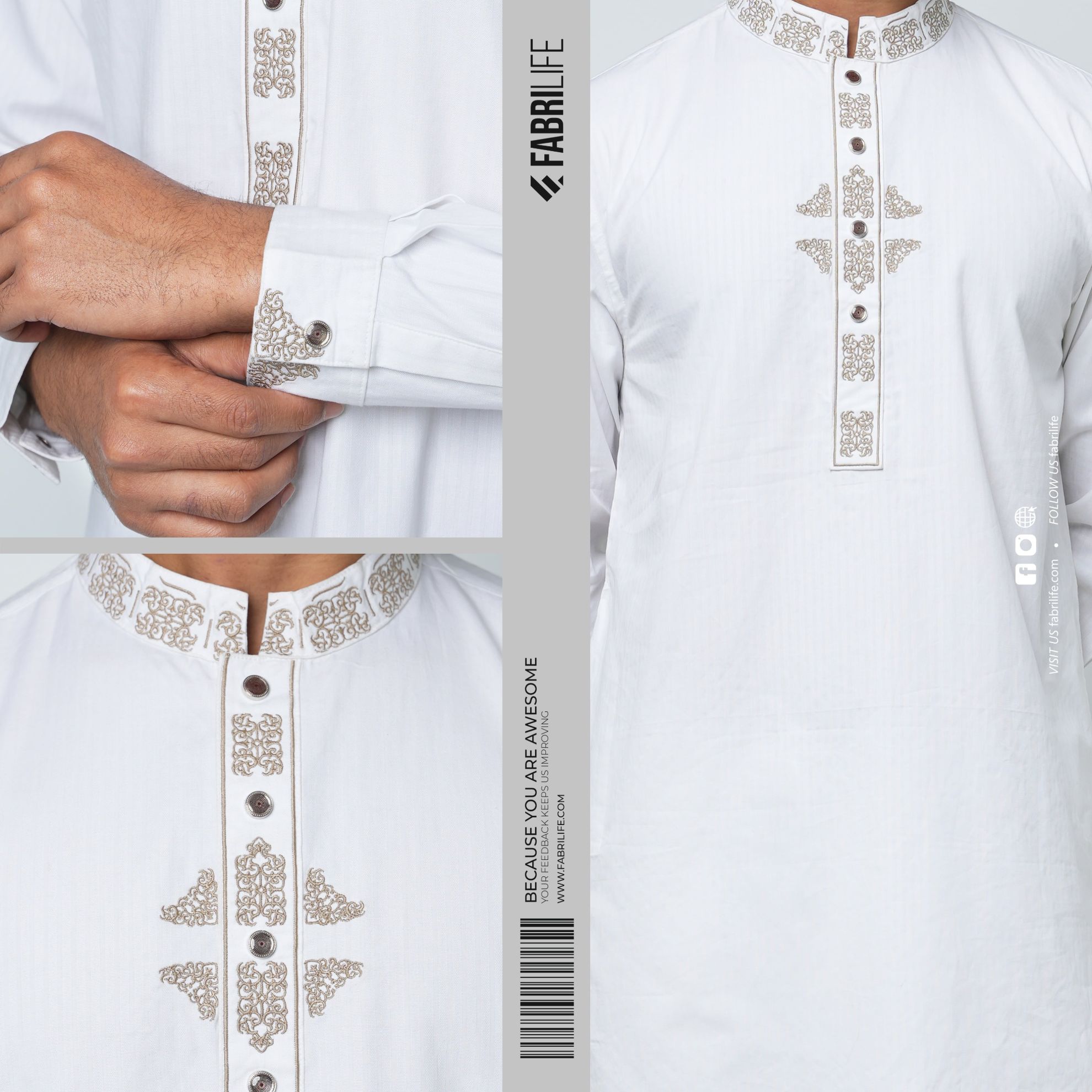 Design: Elegant plain stripe with minimal embroidery for a timeless look