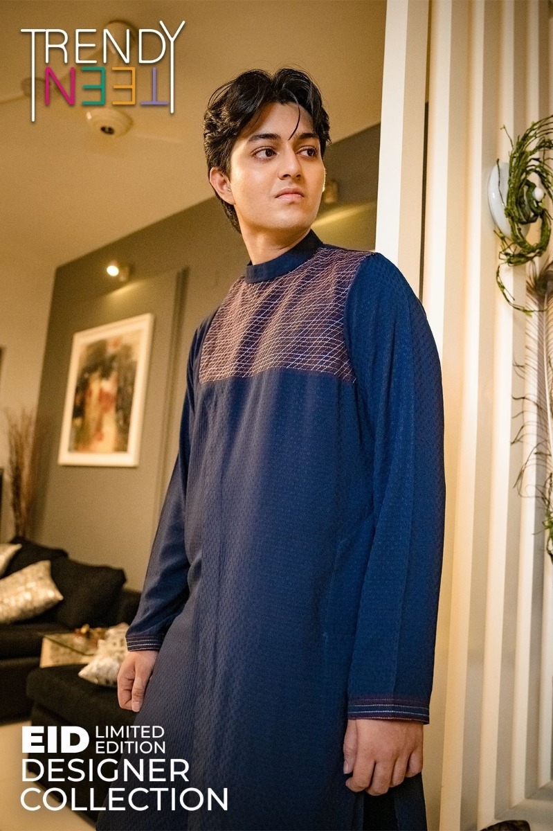 The panjabi showcases a serene blueish gray hue, evoking a sense of tranquility and sophistication. Its premium fabric boasts a subtle texture, adding depth and visual interest to the garment. Tailored to perfection, the silhouette of this panjabi is designed to flatter the masculine form, offering a sleek and polished look.