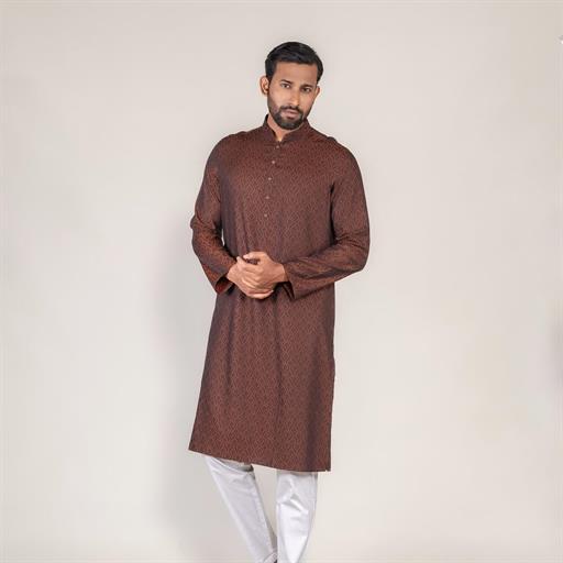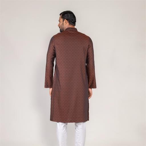 • All-over jacquard design panjabi • Metal button closure • Round cut band collar