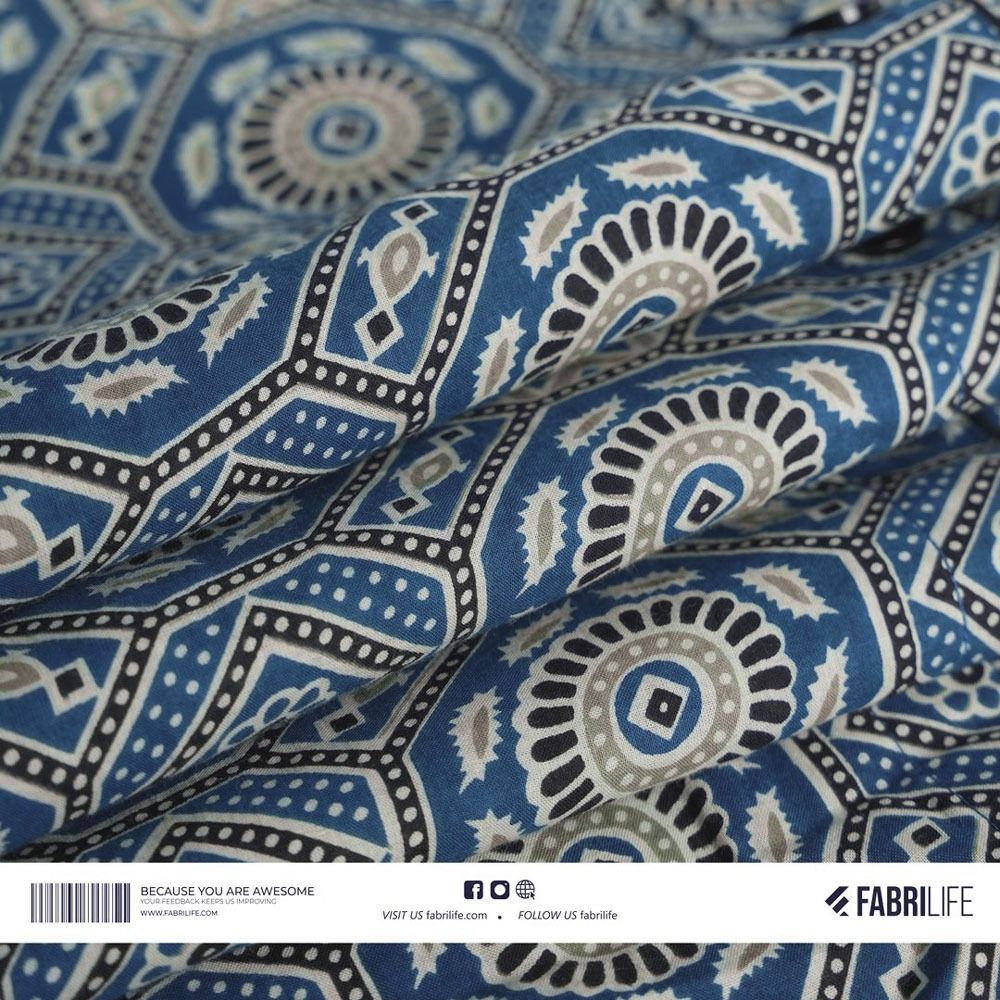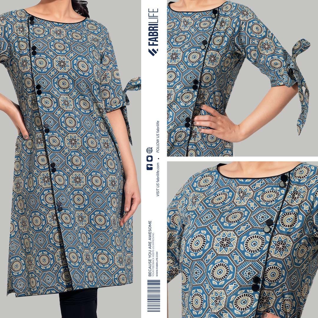 Step into elegance with the Elliyana kurti, crafted from 100% cotton Joypuri fabric with a soft 80~90 GSM finish. The vibrant all-over print (AOP) in blue hues is perfectly complemented by black contrast detailing, making this piece a blend of comfort and timeless style.