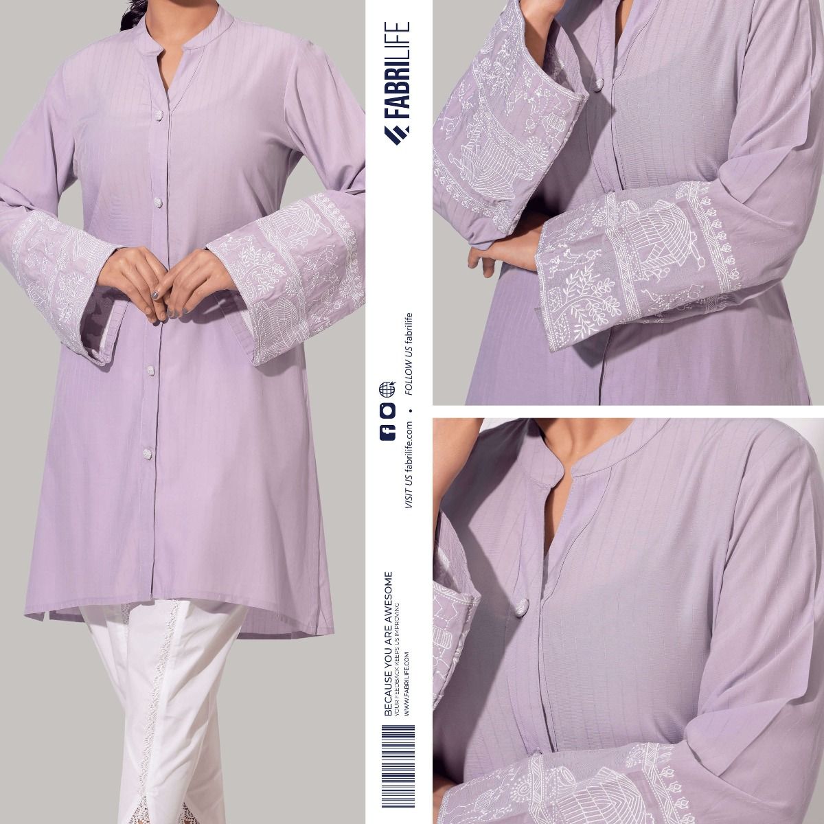 Introducing our enchanting lavender kurti, a perfect blend of elegance and artistry. This stunning piece features delicate embroidery on the sleeve cuffs, showcasing intricate designs that add a touch of sophistication and charm.
